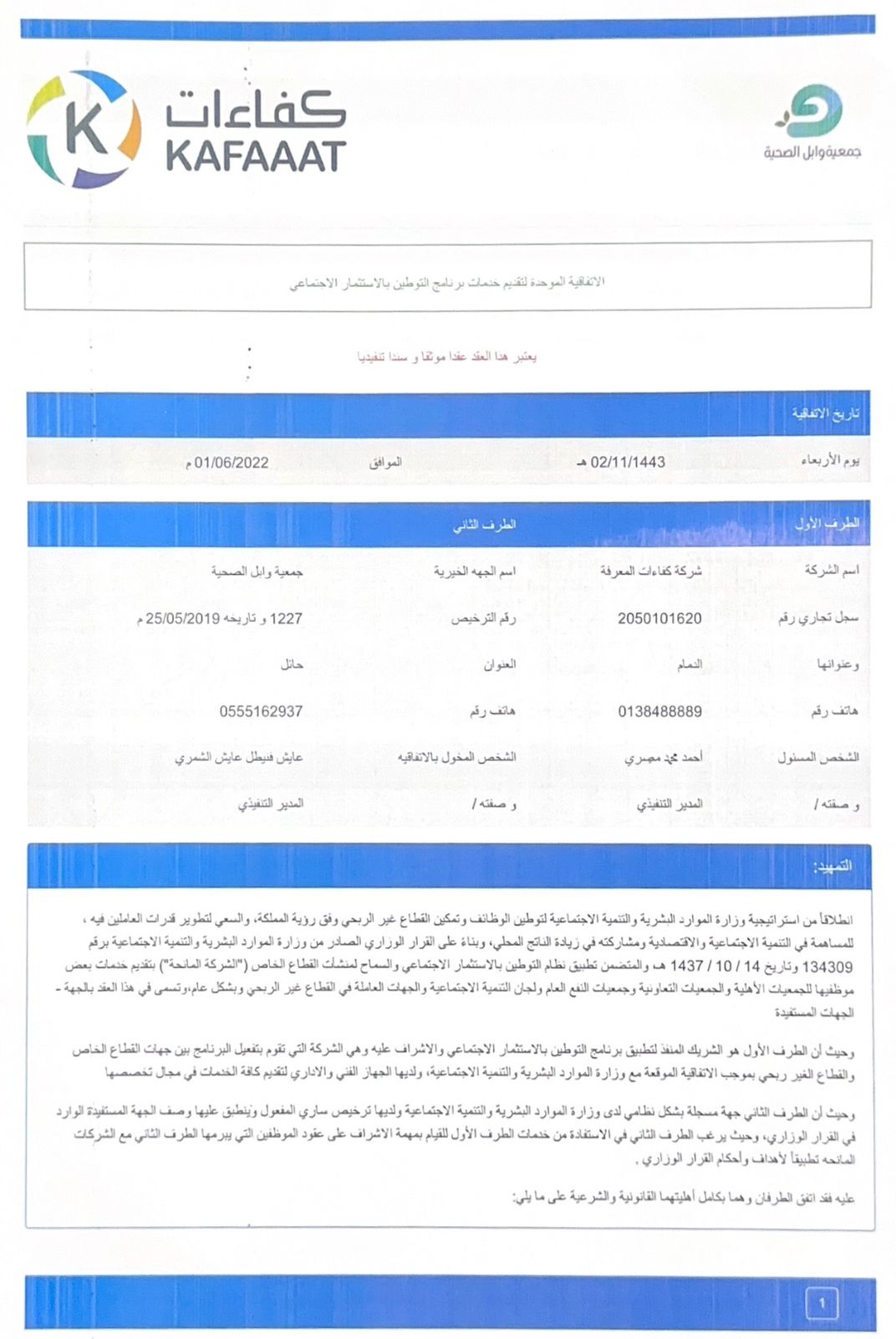 تم توقيع اتفاقية بين جمعية وابل الصحية وشركة كفاءات المعرفة.