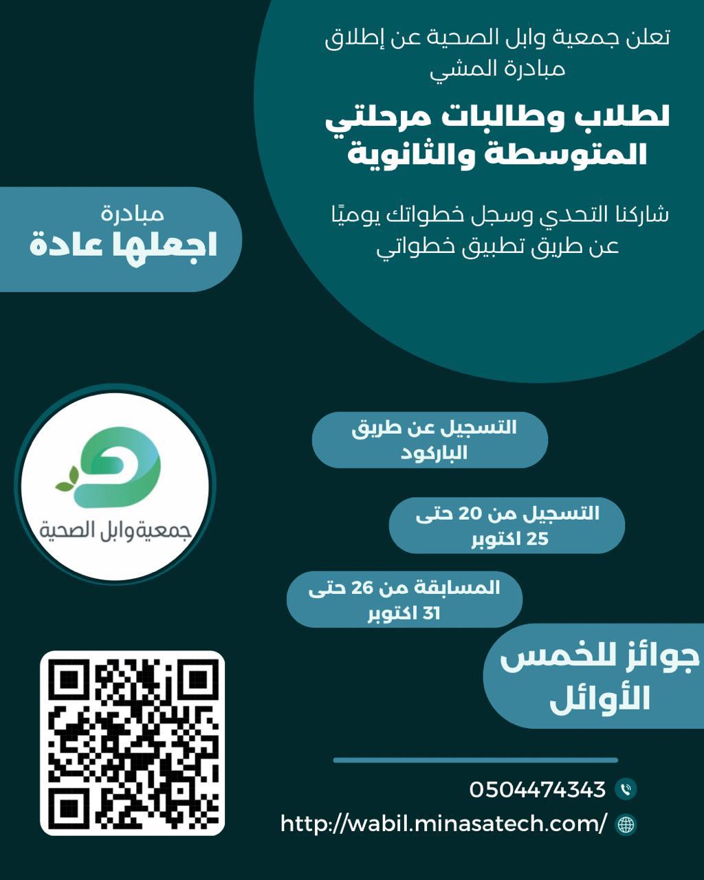 التي أطلقتها #جمعية_وابل_الصحية لطلاب وطالبات المرحلتين المتوسطة والثانوية، بهدف تعزيز ثقافة المشي والنشاط البدني 🌿