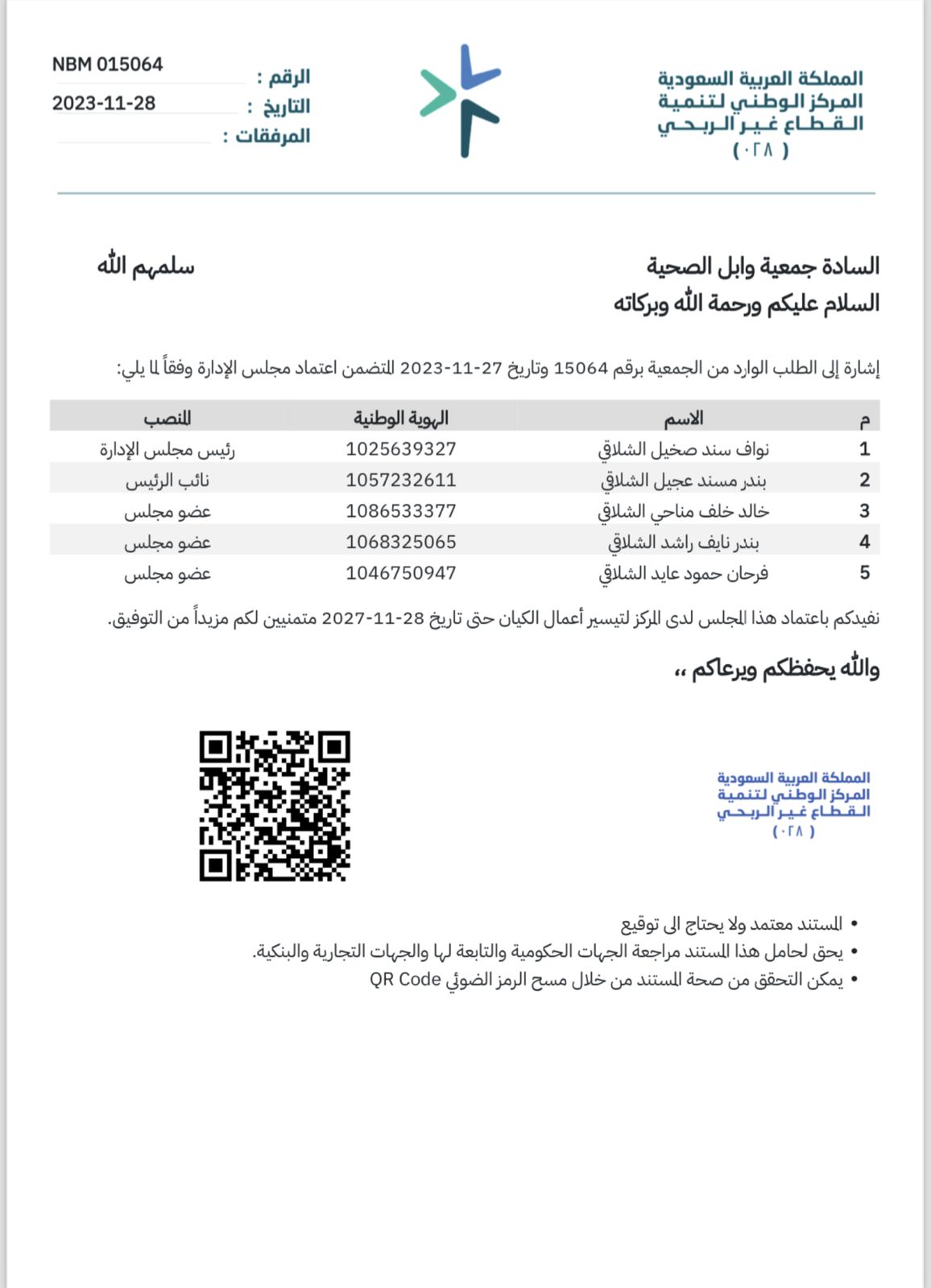 للمركز الوطني لتنمية القطاع الغير ربحي جاء اعتماد المركز لمجلس الإدارة الجديد بتاريخ 27-11-2023